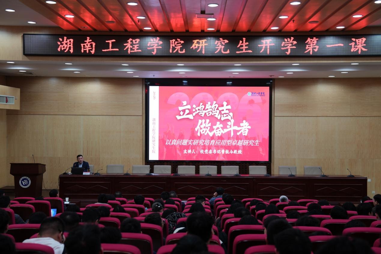 3月11日,我校2026年春季学期“研究生思政第一课”在第二报告厅举行。校党委书记曹执令以“立鸿鹄志 做奋斗者”为主题,为全校研究生讲授了一堂思想深刻、情真意切的思政大课,勉励研究生将个人理想融入时代发展,以“真问题、实研究”锤炼过硬本领,争做堪当民族复兴重任的应用型卓越研究生。2026年是“十五五”规划的开局之年,本次课程为新征程上湖工研究生的成长成才指明了方向。